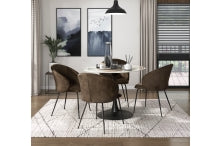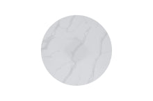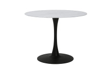 La base de metal negro se eleva para sostener el tablero de vidrio templado con estampado de mármol, cuyo tono blanco complementa elegantemente la decoración de su comedor.
