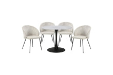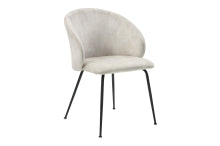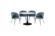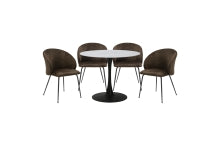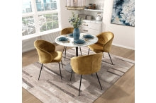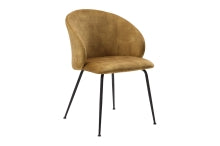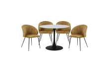 A juego con la mesa, se encuentran sillas auxiliares tapizadas en terciopelo, disponibles en una gama de tonos que incluyen verde azulado, mostaza, marrón y beige.