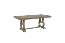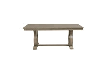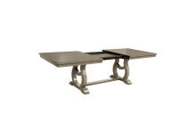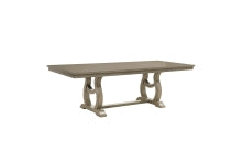 La base de caballete de la mesa proporciona un soporte sólido y un toque decorativo único. El servidor que la acompaña ofrece espacio de almacenamiento, con un elegante marco sobre las puertas de espejo envejecido.