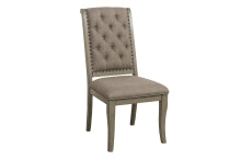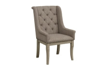Un sutil acabado bisqué realza la veta distintiva de la chapa de roble. Una tela capitoné con botones en tonos neutros cubre las sillas principales y auxiliares de la colección, cada una adornada con detalles de tachuelas y patas de madera a juego.